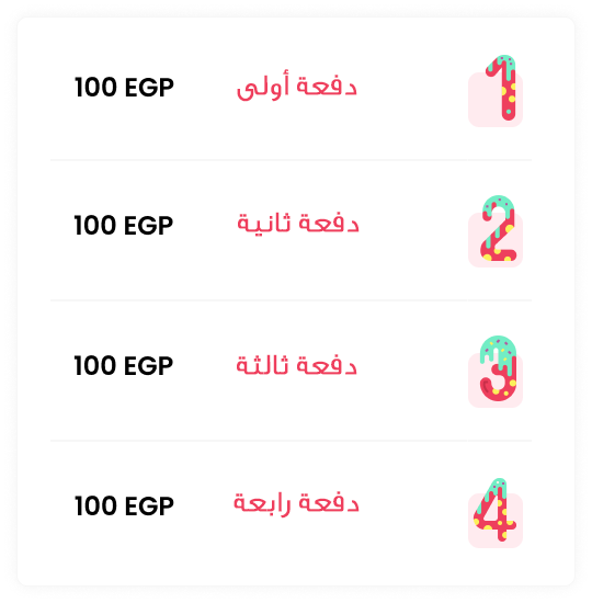 اشتري دلوقتي و ادفع بعدين علي ٣، ٤، أو ٥ دفعات بـ 0٪ فوائد كل أسبوع، كل أسبوعين، أو كل شهر. ادفع بالطريقة اللي تريحك!